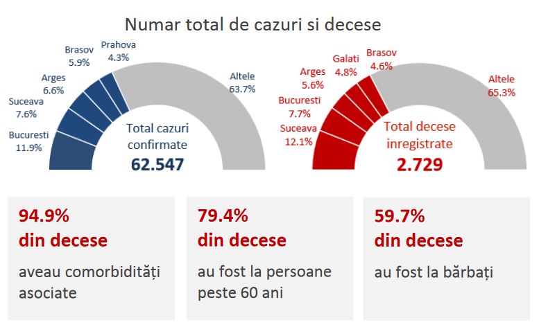 Până la 9 august 2020, vârsta medie a persoanelor decedate era de 69 de ani, 59,7% fiind de sex masculin (1.628 persoane). O mare parte dintre persoanele decedate avea cel puţin o comorbiditate dintre: afecţiuni cardiovasculare (76,3%), diabet (36,2%), afecţiuni neurologice (24,8%), afecţiuni renale (22,4%), obezitate (21,1%), afecţiuni pulmonare (17,4%), neoplasm (13,2%), altele (22,2%), relevă Raportul CNSCBT.