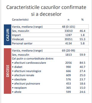 Dintre cele 71.194 cazuri analizate până la 16 august, 46,4% (33.010 persoane) erau de sex masculin, 1,8% erau cazuri de import (1.287), iar 5,8% (4.134) erau reprezentate de personal sanitar. Vârsta medie a persoanelor infectate cu COVID-19 era, până la data menţionată, de 48 de ani, mai informează raportul. Numărul de persoane vindecate era, la data analizei, de 55,3% (39.351 persoane).