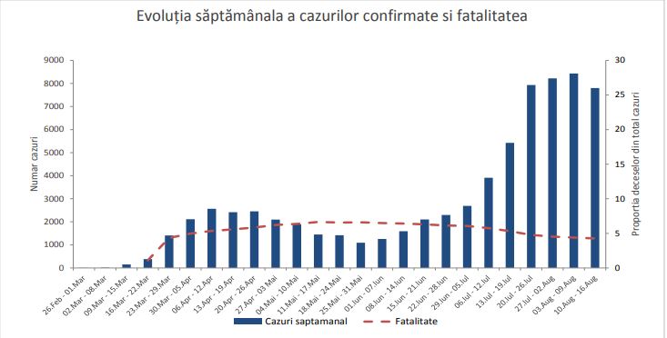 Analiza cazurilor de COVID-19 pe săptămâni evidenţiază că în intervalul 10 - 16 august 2020, numărul infectărilor a scăzut uşor faţă de săptămânile 27 iulie - 2 august şi 3-9 august 2020, dar rămâne mai ridicat în comparaţie cu restul săptămânilor începând din luna martie.