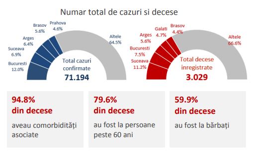 Până la 16 august 2020, vârsta medie a persoanelor decedate era de 69 de ani, 59,9% fiind de sex masculin (1.813 persoane). O mare parte dintre persoanele decedate avea cel puţin o comorbiditate dintre: afecţiuni cardiovasculare (84,5%), diabet (40,7%), afecţiuni neurologice (27,4%), afecţiuni renale (25,0%), obezitate (23,7%), afecţiuni pulmonare (18,6%), neoplasm (15,0%), altele (24,6%), relevă Raportul CNSCBT.