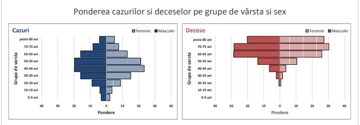 În ceea ce priveşte ponderea îmbolnăvirilor pe grupe de vârstă şi sex, se observă că, atât la femei, cât şi la bărbaţi, cele mai afectate grupe de vârstă sunt 40-49 ani (aproximativ 24% la femei şi 20% la bărbaţi) şi 50-59 ani (aproximativ 22% la femei şi 20% la bărbaţi). Situaţia până la 16 august a rămas aproximativ aceeaşi ca la analizele din ultimele opt săptămâni în privinţa grupelor de vârstă şi sex.