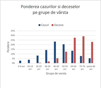 Referitor la ponderea deceselor pe grupe de vârstă şi sex, cele mai multe decese la femei erau asociate, până la data amintită, cu grupele de vârstă 70-79 ani (aproximativ 31%), peste 80 de ani (aproximativ 28%) şi 60-69 ani (aproximativ 26%). La bărbaţi, categoriile de vârstă cele mai afectate de decese erau 60-69 ani (29%) şi 70-79 ani (29%); grupa de vârstă peste 80 de ani era afectată în proporţie de aproximativ 20%, până la 16 august 2020, conform www.cnscbt.ro. AGERPRES/(Documentare - Ruxandra Bratu, editor: Marina Bădulescu, editor online: Andreea Lăzăroiu)