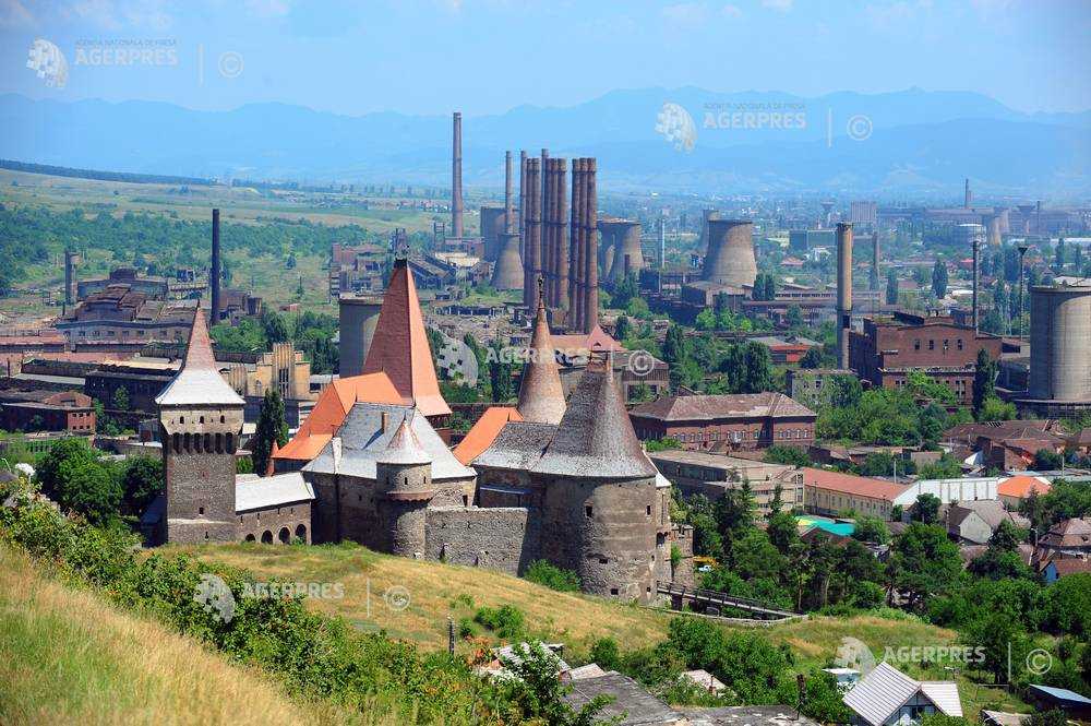 În prim plan, Castelul Corvinilor din Hunedoara; în plan secund, profilul industrial al oraşului