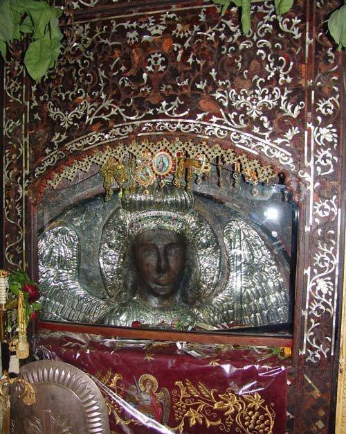 Dezmeticit după cele petrecute, călugărul a luat decizia să picteze Arhanghelul, folosind un burete cu care a strâns sângele călugărilor ucişi şi utilizând lut alb. A desenat chipul Arhanghelului aşa cum l-a văzut pe acoperişul bisericii. Icoana pictată a Arhanghelului a săvârşit numeroase minuni. A avertizat membrii obştei de venirea unui raid al piraţilor saracini şi a contribuit la protejarea aşezământului. Clădirea actualei biserici a fost definitivată mulţumită sprijinului divin oferit de Arhanghel, care a indicat şi locul unde să fie ridicat lăcaşul de cult, conform https://www.monastiria.gr/.