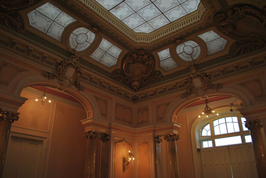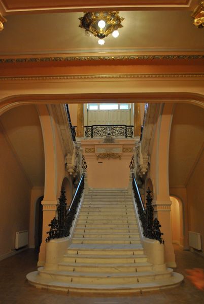 Valoroasa stucatură, în parte aurită, luminatoarele, oglinzile veneţiene, plafoanele şi cartuşele pictate, candelabrele cu ornamente din cristal de Murano, coloanele, scările din marmură de Carrara, pereţii tapisaţi cu mătase de Lyon, lambriurile, mobilierul stil, feroneria etc., toate dau încăperilor un aer de eleganţă şi gust rafinat.