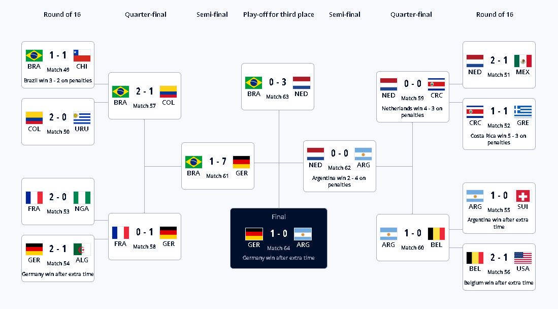 În prima semifinală a turneului final, ţara gazdă Brazilia, chiar în faţa propriilor suporteri, a încasat un scor neverosimil, 7-1 pentru Germania. În celălalt meci din semifinale, Argentina lui Lionel Messi, considerat de presa de specialitate drept cel mai în măsură să-i succeadă lui Diego Maradona în fruntea fotbalului argentinian, a învins Olanda la penalty (4-2), după ce scorul înregistrat în timpul regulamentar fusese alb (0-0), potrivit https://www.fifa.com/. Olanda a câştigat finala mică a turneului din Brazilia, învingând naţionala Selecao cu 3-0.