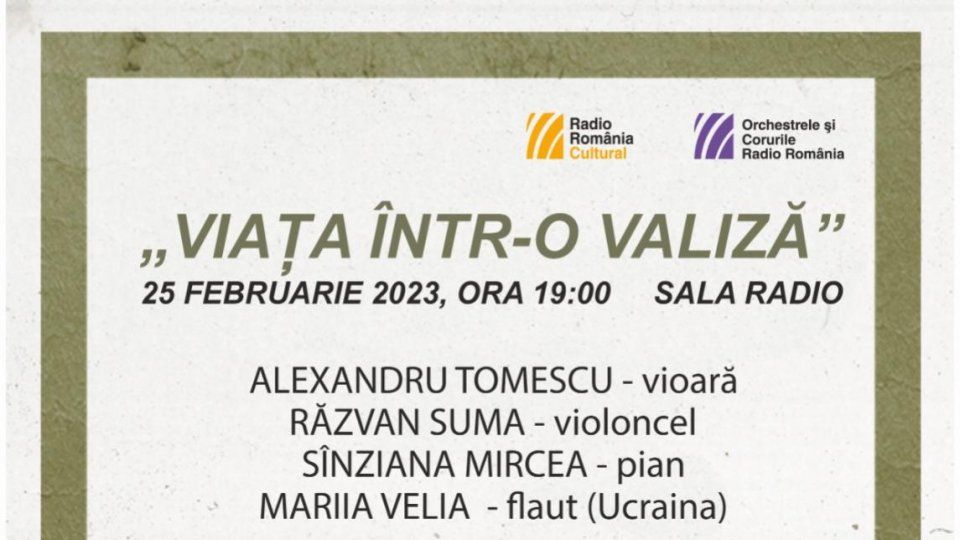 25 februarie - Are loc recitalul "Viaţa într-o valiză", organizat de Radio România Cultural şi Orchestrele şi Corurile Radio la Sala Radio, de la ora 19.00. Protagonişti sunt violonistul Alexandru Tomescu, violoncelistul Răzvan Suma şi pianista Sînziana Mircea. Începând cu aceeaşi zi, tot la Sala Radio, este găzduită expoziţia de pictură şi artă contemporană "Viaţa într-o valiză", proiect iniţiat de actriţa Iulia Mihalcea şi regizorul Iulian Furtună. Evenimentele marchează un an de la invazia Rusiei în Ucraina.