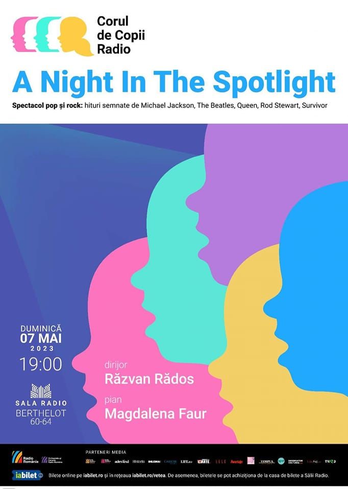* Corul de Copii Radio susţine un concert special, intitulat "A Night in the Spotlight" ("O seară în lumina reflectoarelor"). Evenimentul are loc Sala Radio în ziua de duminică, 7 mai, de la ora 19.00. Programul cuprinde prelucrări corale ale unor cunoscute piese pop şi rock, hit-uri interpretate de Queen, The Beatles, Rod Stewart, Michael Jackson ş.a.