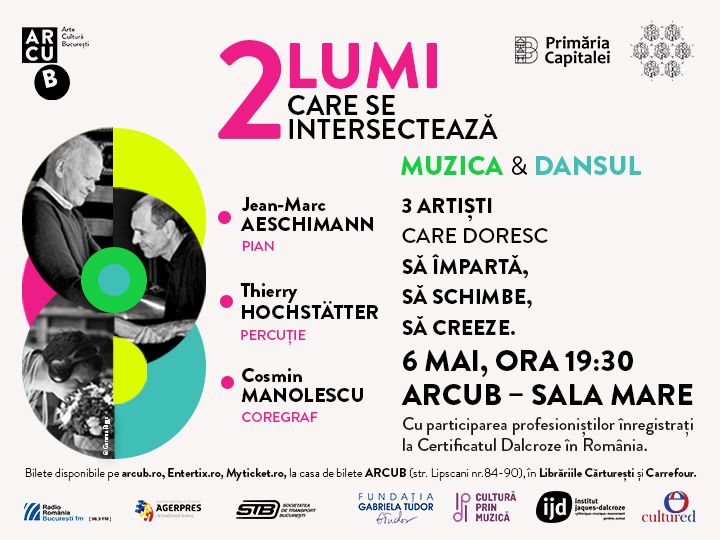 * Spectacolul performativ "Două lumi care se intersectează", conceput de Jean-Marc Aeschimann, Thierry Hochstatter, Cosmin Manolescu, în parteneriat cu Asociaţia Cultură prin Muzică şi Fundaţia "Gabriela Tudor", are premiera în ziua de 6 mai, la Sala Mare ARCUB, de la ora 19.30.
