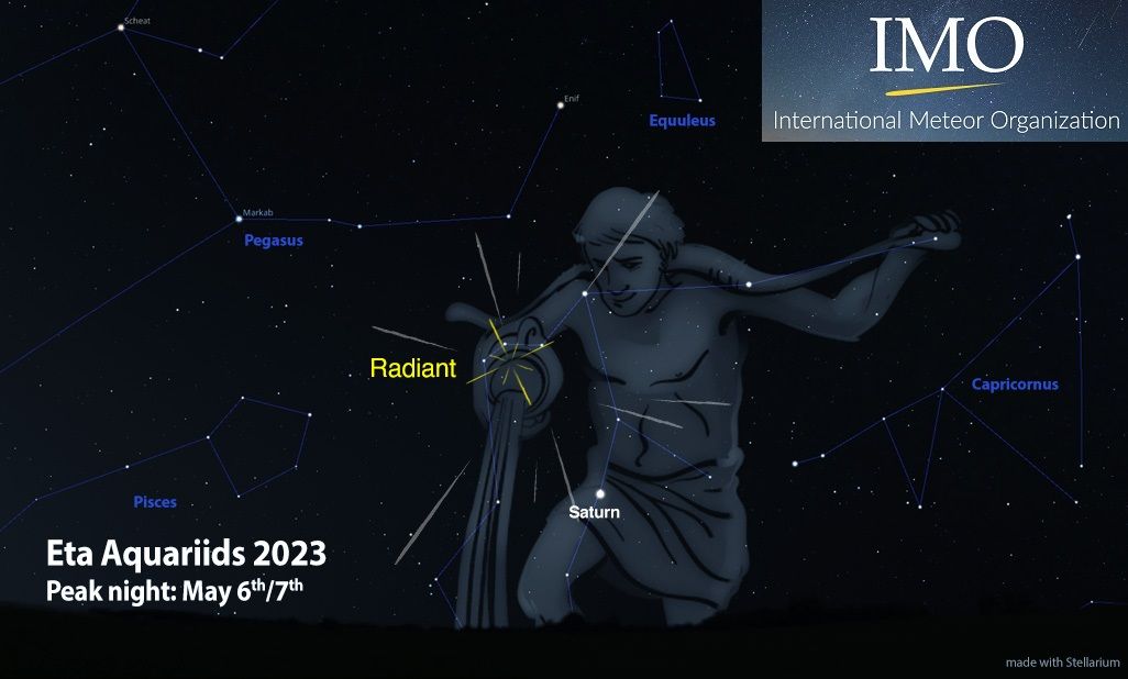 Curentul de meteori Eta Aquaride este activ între 15 aprilie şi 27 mai 2023. Similar cu ploaia de meteori Orionide din octombrie, ploaia de meteori Eta Aquaride este cauzată de gheaţă şi praf lăsate în urmă de cometa Halley. Când Pământul trece printre resturile cometei, "fărâmăturile de cometă" se încălzesc pe măsură ce intră în atmosfera Pământului, producând "stele căzătoare" impresionante care străbat cerul.
