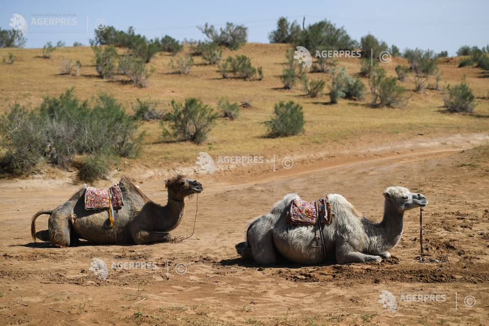 Cămile în tabăra de iurte ”Safari” din deşertul Kyzylkum, Uzbekistan, 23 mai 2022.
