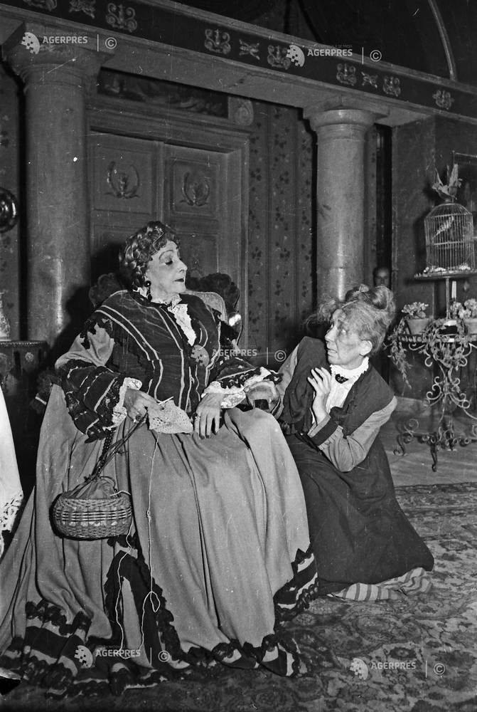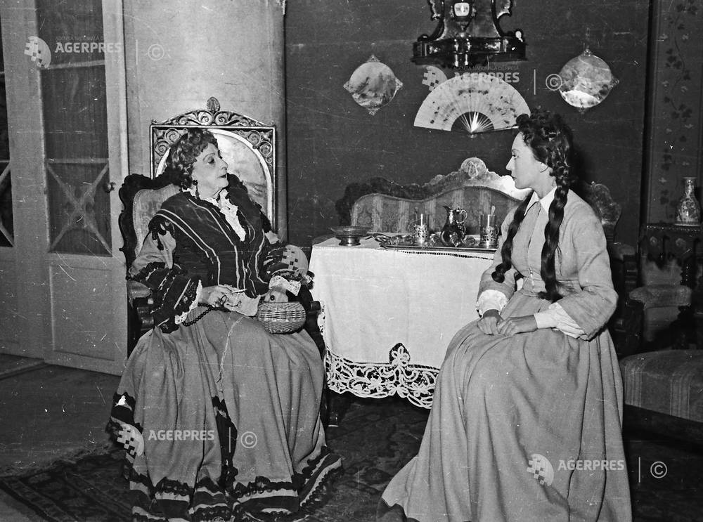 Actriţele Lucia Sturdza-Bulandra (stg.) şi Marietta Rareş în piesa de teatru ”'Pădurea”, montată pe scena Teatrului Municipal Bulandra, Bucureşti, 23 octombrie 1952.