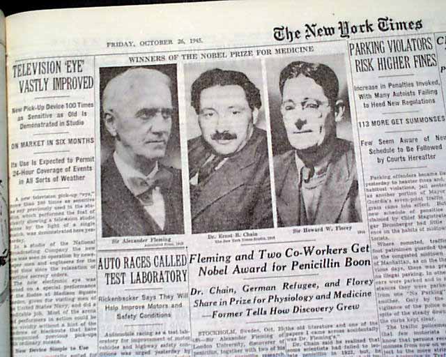 Fleming, Chain şi Florey au primit în 1945 Premiul Nobel pentru Fiziologie sau Medicină ''pentru descoperirea penicilinei şi a efectelor curative ale acesteia în diverse boli infecţioase'' potrivit www.nobelprize.org.