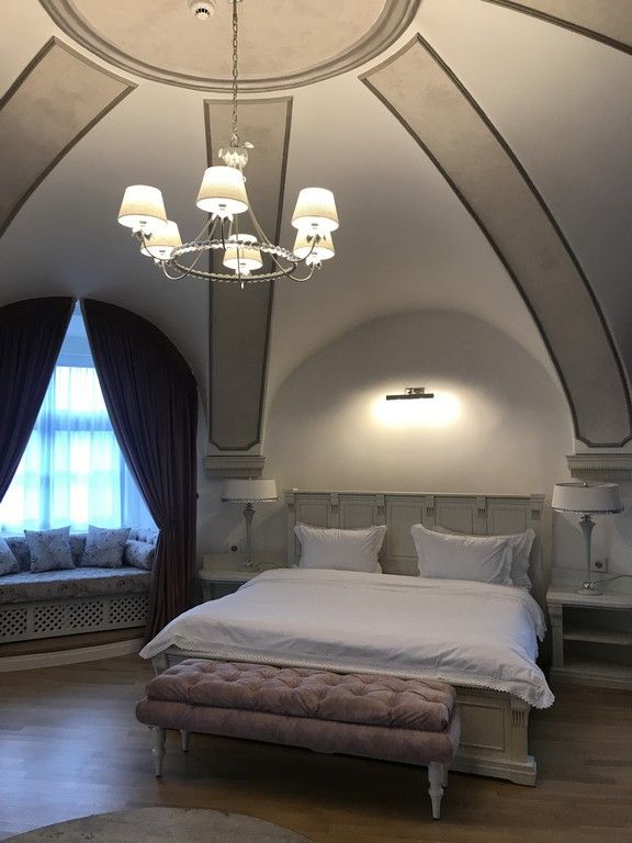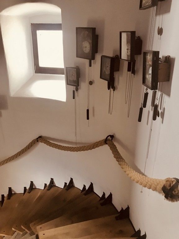 La etajele superioare ale castelului se urcă pe o scară în spirală, realizată din lemn masiv, iar pe holul scării sunt expuse, din loc în loc, ceasuri vechi. În castel există încăperi pentru relaxare sau pentru a sta la masă, o încăpere decorată cu trofee de vânătoare, dar şi o cameră decorată cu... capul lui Bachus - zeul vinului şi al viţei-de-vie. În încăperile castelului se află şi creaţii vestimentare inspirate de motive tradiţionale româneşti.