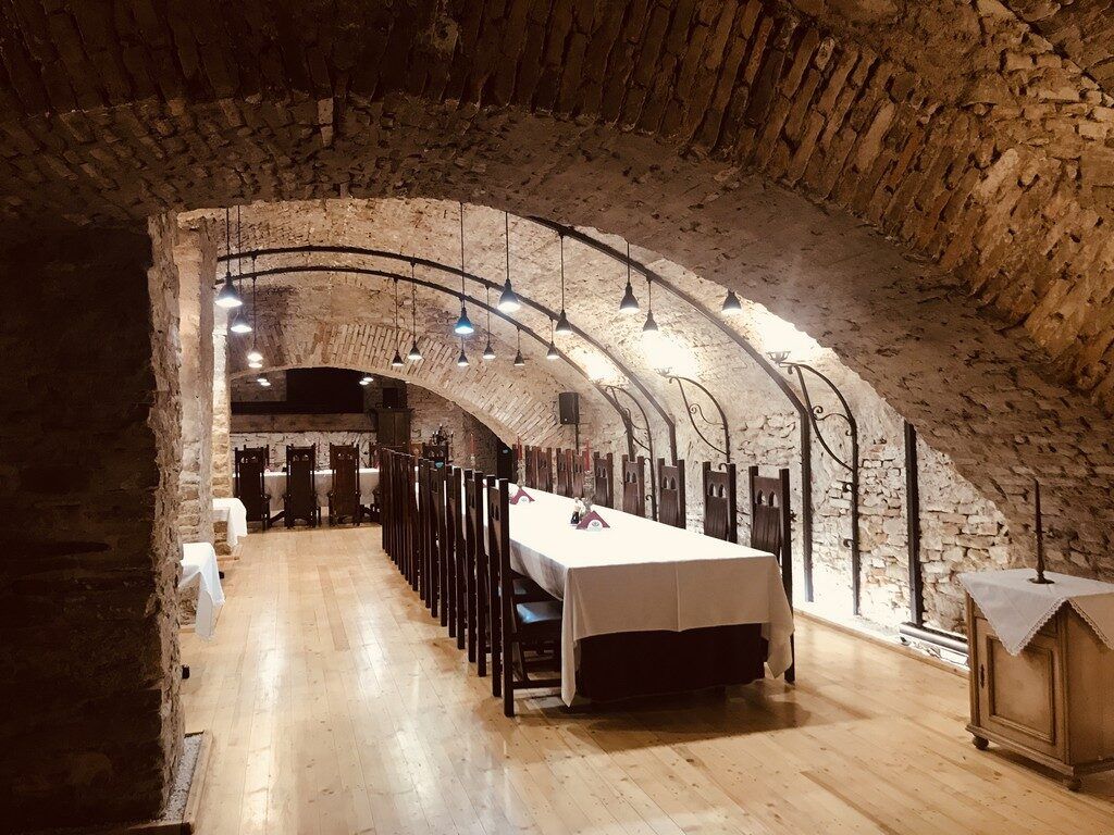 Din sala de la parter se poate trece în bucătărie, dar se poate coborî şi în beciul castelului, unde odinioară se aduceau animalele vânate. Ferestrele beciului au, în prezent, vitralii colorate, iar în turnurile cilindrice sunt depozitate vinuri vechi.