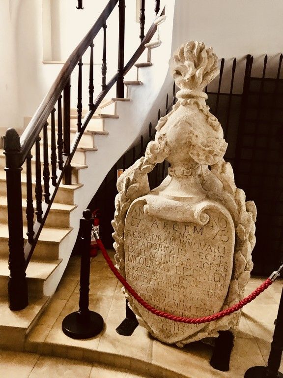 După intrarea în castel, în lateralele unei uşi mici se află blazonul familiei Bethlen şi o pisanie (ce aminteşte de renovarea castelului). Ambele decoraţiuni erau sculptate în piatră şi, în trecut, erau amplasate pe frontispiciul castelului. Deasupra acestei uşi există roata unui scripete - care, probabil, ajuta la ridicarea podului care făcea trecerea peste un sanţ cu apă. Tot această uşă duce spre sala de la parter, decorată cu armuri şi obiecte de artă - între care un tablou care arată intrarea lui Mihai Viteazul în Alba Iulia.