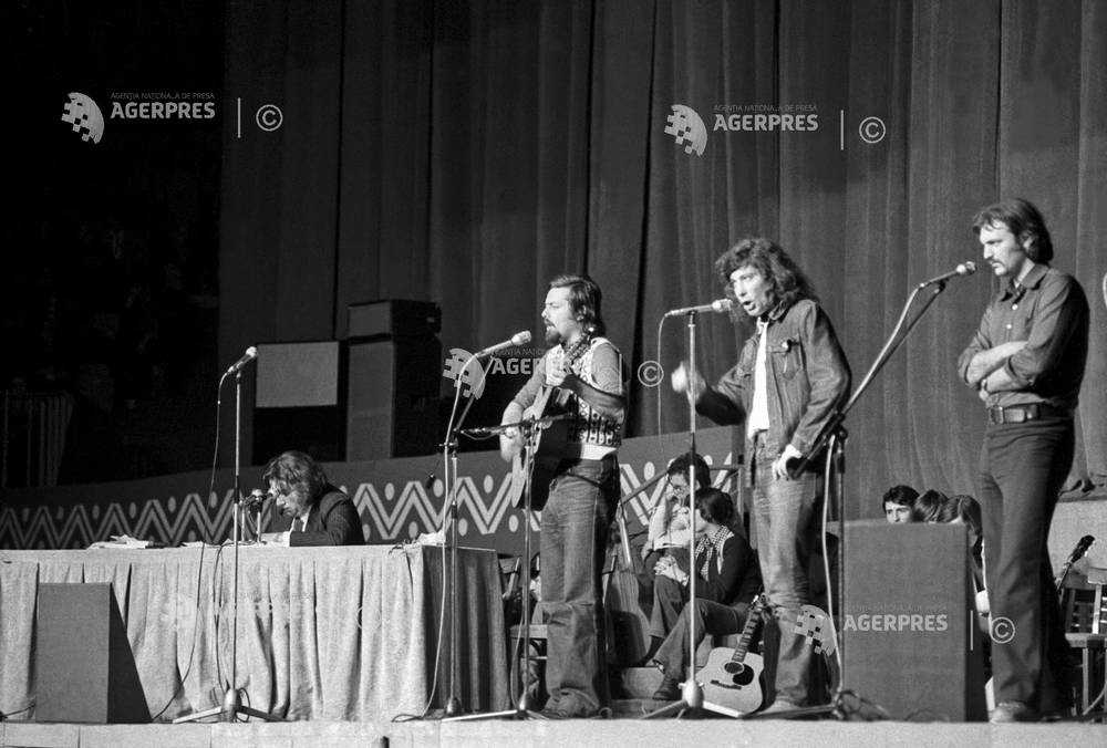 Adrian Păunescu, Victor Socaciu, Florian Pittiş, Adrian Ivaniţchi, Sorin Minghiat în spectacol al Cenaclului Flacăra, la Sala Polivalentă, 1979.