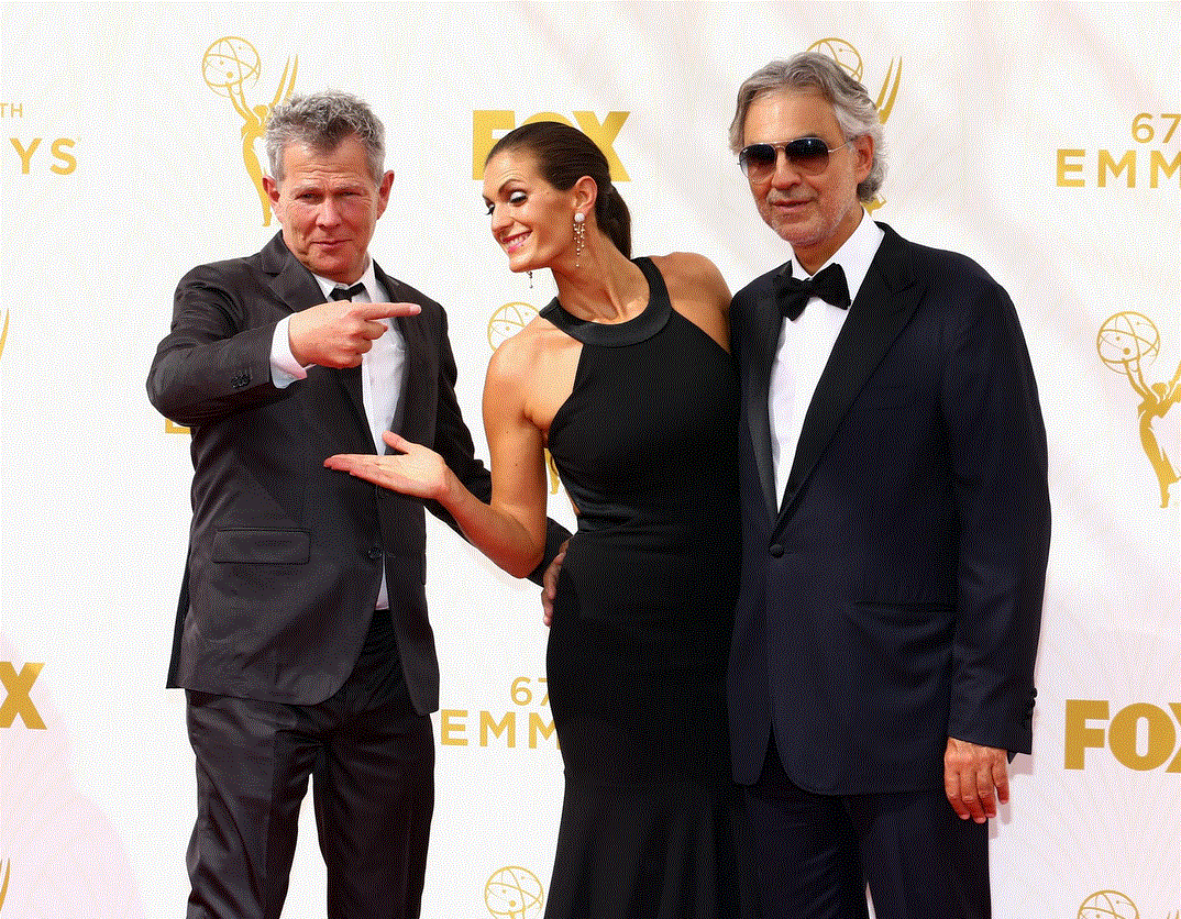 (de la stg.la dr.) David Foster, Veronica Berti şi Andrea Bocelli, la cea de-a 67-a ediţie a Premiilor Emmy (2015).