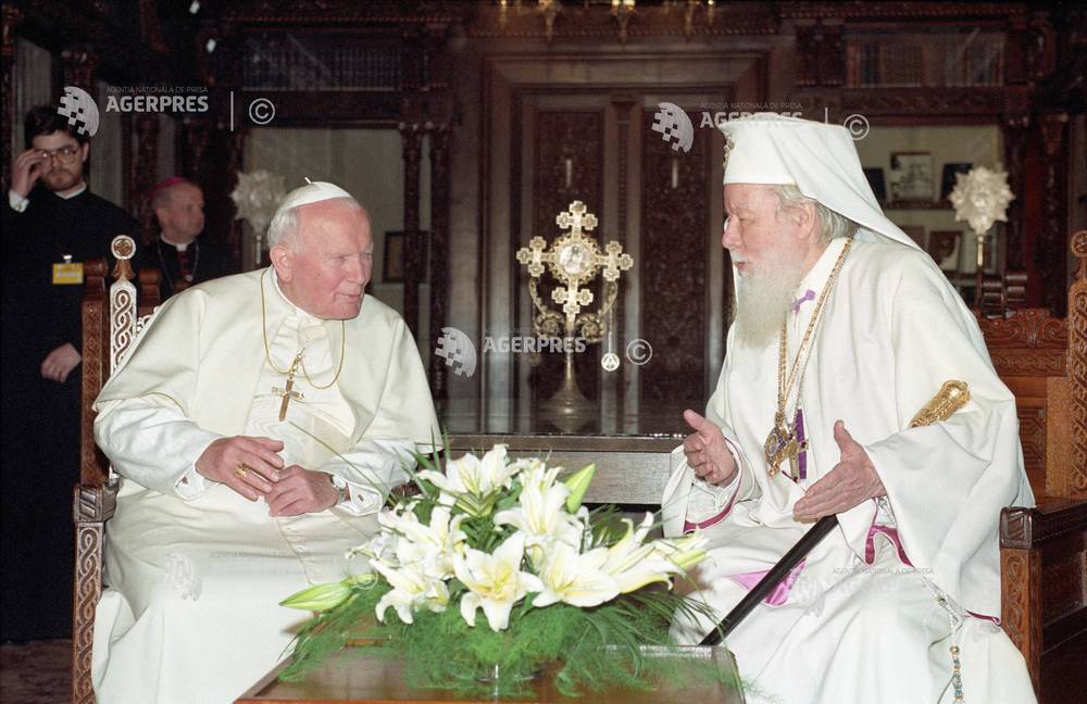 Vizita Papei Ioan Paul al II-lea in România, in perioada 7-9 mai 1999. în imagine: Papa Ioan Paul al II-lea (stg) şi Prea Fericitul Părinte Teoctist, Patriarhul Bisericii Ortodoxe Române (dr.), la Reşedinţa Patriarhală.