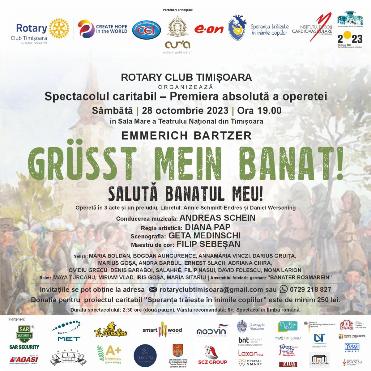 * Pe scena Teatrului Naţional din Timişoara va fi prezentată sâmbătă, 28 octombrie, de la ora 19.00, premiera absolută a operetei "Grusst mein Banat" / "Salută Banatul meu", compusă de Emmerich Bartzer în anul 1939, orchestrată şi dirijată acum de timişoreanul Andreas Schein. Producţia este un eveniment caritabil, dedicat susţinerii Secţiei Chirurgicale de Cardiologie Pediatrică a Institutului de Boli Cardiovasculare (IBCV) Timişoara. În rolurile principale vor fi Marius Goşa, Maria Boldan, Bogdan Aungurence, Annamaria Vinczi, Darius Gruiţa, Andra Barbul.