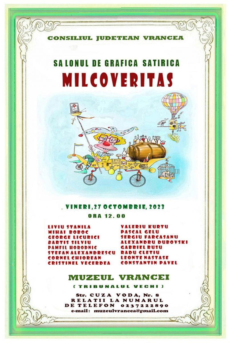* Salonul de Grafică Satirică Milcoveritas are loc în perioada 27-29 octombrie, la Muzeul Vrancei din Focşani. Vor fi expuse 70 de lucrări semnate de 16 graficieni consacraţi: Liviu Stănilă, Mihai Boboc, George Licurici, Silviu Bartis, Pamfil Horodnic, Ştefan Alexandrescu, Cornel Chiorean, Cristinel Vecerdea, Valeriu Kurtu, Pascal Gelu, Sergiu Fărcăşanu, Alexander Dubovsky, Gabriel Rusu, Radu Cleţiu, Leonte Năstase şi, desigur, Constantin Pavel, curatorul evenimentului, se arată într-un comunicat al Muzeului Vrancea. Vernisajul este programat la 27 octombrie, ora 12.00, în foaierul Muzeului Vrancei (fostul Palat de Justiţie). Expoziţia, organizată de Consiliul Judeţean Vrancea, prin Muzeul Vrancei, va putea fi vizitată gratuit în perioada 27-29 octombrie, între orele 10.00 şi 18.00.