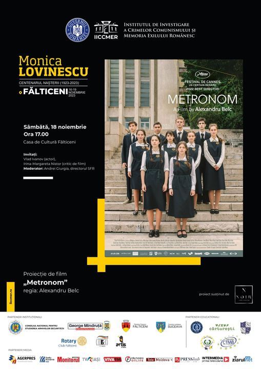 * Tot la 100 de ani de la naşterea Monicăi Lovinescu, Asociaţia Artis din Iaşi va proiecta, în perioada 16-19 noiembrie 2023, la Casa de Cultură Fălticeni, documentare, filme în premieră şi producţii premiate. Proiecţiile vor avea loc în cadrul Seriei de manifestări, Monica Lovinescu - Centenarul Naşterii (1923 - 2023)", organizată de Institutul de Investigare a Crimelor Comunismului şi Memoria Exilului Românesc (IICCMER).