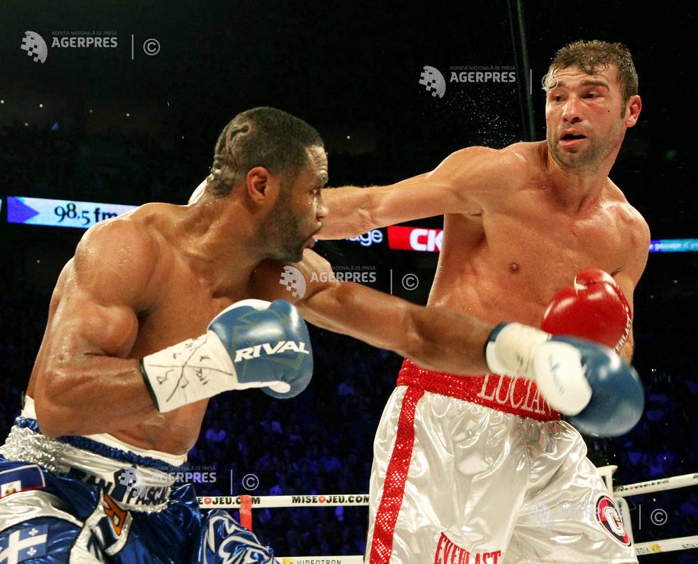 Boxerul român Lucian Bute (2dr.) a fost învins la puncte, decizie în unanimitate, de britanicul James DeGale, într-un meci pentru titlul mondial IBF la categoria supermijlocie, desfăşurat pe durata a 12 runde, în gala profesionistă de la Centre Videotron din Quebec (Canada), 29.11.2015.