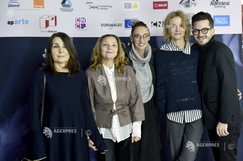 În imagine (de la stg. la dr.) Anca Damian (regizorul filmului), Rodica Negrea, Ilona Brezoianu, Lia Bugnar şi actorul Alexandru Nagy pozează la premiera filmului 'Moon Hotel Kabul' , 23.11.2018.