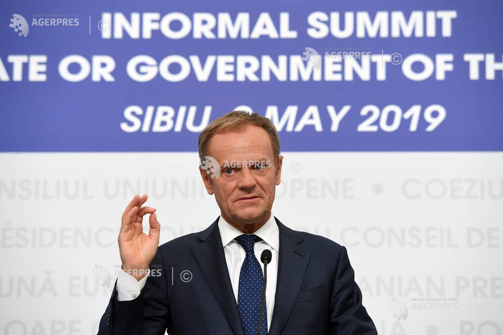 Donald Tusk, preşedintele Consiliului European, face declaraţii de presaă după ce a participat la Summitul informal al şefilor de stat şi de Guvern ai Uniunii Europene, organizat la Sibiu.