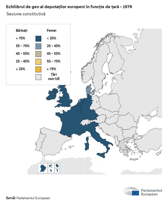 Primul Parlament European (PE), rezultat în urma alegerilor europarlamentare din 1979, cuprindea 16% femei şi 84% bărbaţi. De la o legislatură la alta, cota de gen a crescut treptat, ajungându-se, în 2019, la 41% femei şi 59% bărbaţi în PE, conform site-ului https://results.elections.europa.eu/ro/echilibru-gen-deputati-europeni/1979-1984/.