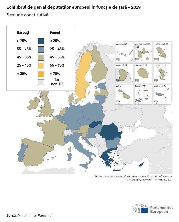 România, Slovacia şi Grecia se numără între ţările din UE, unde femeile erau subreprezentate în cea mai mare măsură, în urma scrutinului din 2019: Slovacia (15% femei şi 85% bărbaţi); Grecia (24% femei şi 76% bărbaţi); România (22% femei şi 78% bărbaţi).