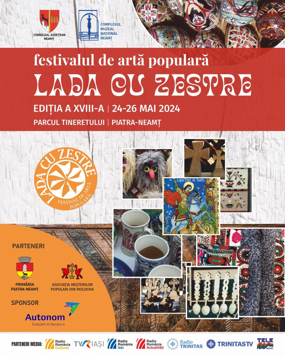 *A 18-a ediţie a Festivalului de Artă Populară "Lada cu zestre" reuneşte, în perioada 24-26 mai, meşteri populari din toate colţurile ţării în Parcul Tineretului din Piatra-Neamţ, anunţă Complexul Muzeal Naţional Neamţ, organizatorul evenimentului.