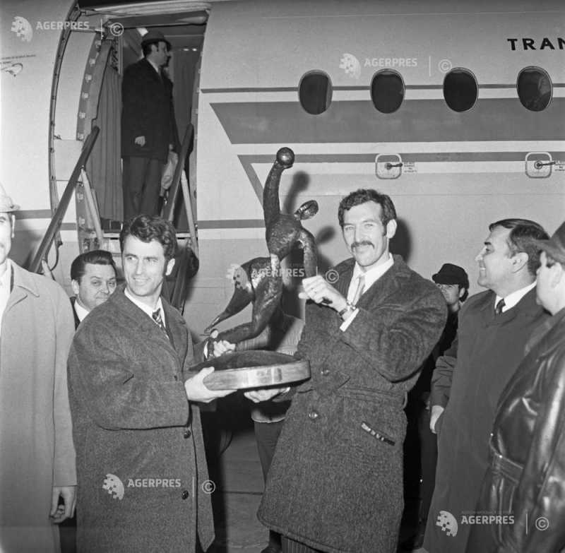 Sosirea pe aeroport a echipei naţionale de handbal a României, după câştigarea celei de-a VIII-a ediţii a Campionatului Mondial de Handbal Masculin desfăşurat in RDG. În imagine : Cristian Gaţu (stg), 1974.