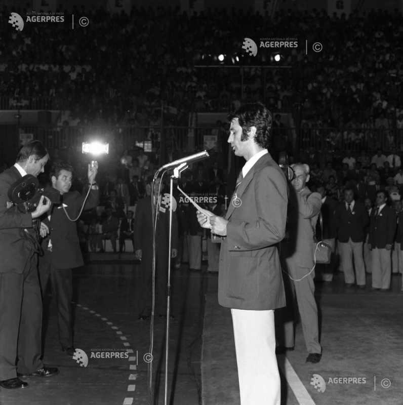 Ceremonia de decorare a sportivilor români, participanţi la Olimpiada de la Montreal. În imagine: handbalistul Cristian Gaţu, 1976.