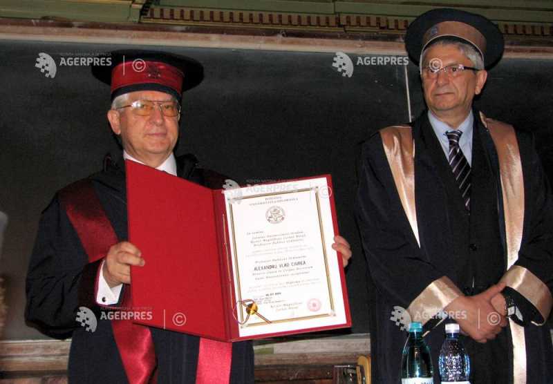 Alexandru Vlad Ciurea (st.), de la Facultatea de Medicină 'Carol Davila' din Bucureşti, vicepreşedinte al Federaţiei Mondiale a Societăţilor de Neurochirurgie, şi Gheorghe Bumbu (dr.), decanul Facultăţii de Medicină din Oradea, la ceremonia în cadrul căreia reputatul neurochirurg a primit titlul de Doctor Honoris Causa al Universităţii Oradea (UO).