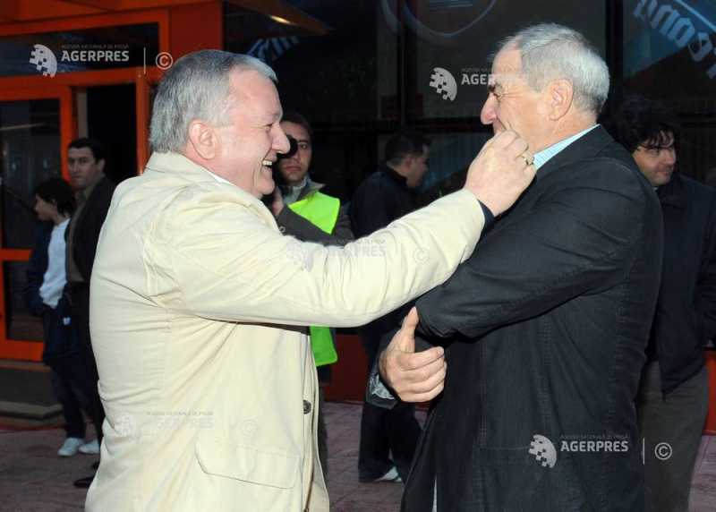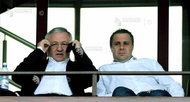 Finanţatorul echipei de fotbal FC Vaslui, Adrian Porumboiu (stg,), şi antrenorul formaţiei CSM Ploieşti, Marius Şumudică, în tribunele meciului dintre Rapid Bucureşti şi FC Vaslui, Bucureşti, 13 septembrie 2009.