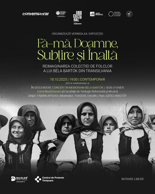 Sâmbătă, 18 octombrie, începând cu ora 19.00, în clădirea Colegiului Academic, va avea loc vernisajul expoziției 'Fă-mă, Doamne, Subțire și Înaltă. Reimaginarea colecției de folclor a lui Bela Bartok din Transilvania'. În deschiderea vernisajului, în Foaierul Colegiului Academic, de la ora 18.00, va avea loc un concert al Corului MusiChorum (corul mixt al Facultății de Teologie Reformată și Muzică din cadrul Universității Babeș-Bolyai, format din studenți ai facultății), gândit ca o explorare muzicală a activității complexe a lui Bartok în Transilvania.