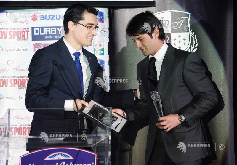 Preşedintele FRF, Răzvan Burleanu (stg), ii oferă fostului internaţional Cristian Chivu (dr) 'Premiul pentru întreaga activitate fotbalistică', în cadrul galei Premiilor Asociaţiei Fotbaliştilor Amatori şi Nonamatori (AFAN), eveniment organizat la Hotelul Howard Johnson.