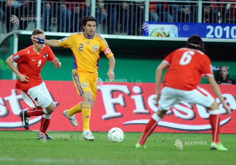 Căpitanul echipei României de fotbal, Cosmin Contra (centru) se pregăteşte să centreze, fiind talonat de jucătorii austrieci Daniel Beichler (stănga) şi Yasin Pehlivan (dreapta), în timpul partidei Austria - România din cadrul preliminariilor Cupei Monfiale FIFA 2010.