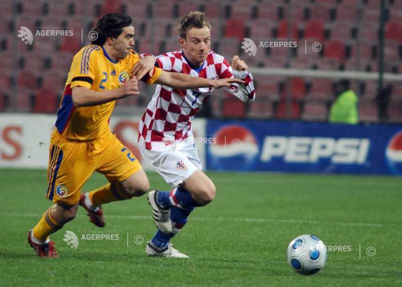 Căpitanul echipei naţionale de fotbal, Cosmin Contra (stg.) luptă pentru balon cu Ivan Rakitic (dr.), în meciul amical de fotbal disputat intre selecţionatele României şi Croaţiei.