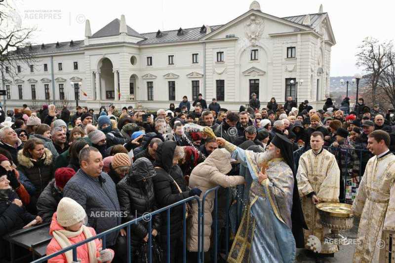 Părintele arhimandrit Dosoftei Scheul binecuvintează credincioşii care participă la slujba prilejuită de sărbătoarea Botezului Domnului (Boboteaza), la Mitropolia Moldovei şi Bucovinei, Iaşi, 6 ianuarie 2025.