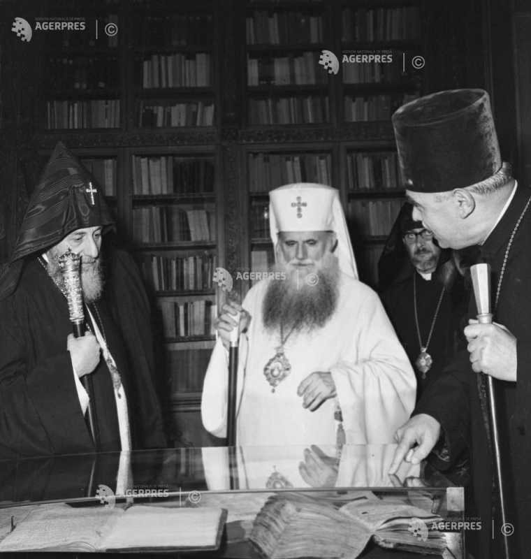 Vizita in ţara noastră a Patriarhului suprem şi catolicos al tuturor armenilor, Vasken I (stg); în imagine alături de Justinian Marina (centru), Patriarhul Bisericii Ortodoxe Române.