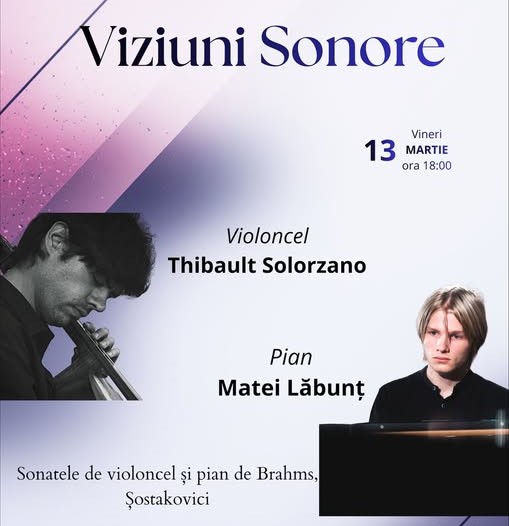 * Muzeul Municipiului București invită publicul vineri, 13 martie, la ora 18.00, la recitalul 'Viziuni sonore', un eveniment cameristic dedicat dialogului artistic dintre violoncelistul Thibault Solorzano și pianistul Matei Lăbunț, potrivit muzeulbucurestiului.ro.