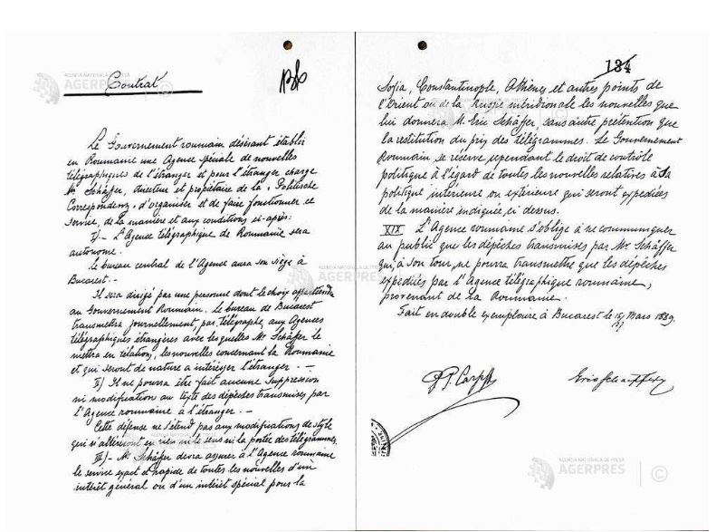Documentele oficiale care au stat la baza înființării primei agenții naționale de presă datează din zilele de 15/27 și 16/28 martie 1889, ambele conținând în mare aceleași înscrisuri, și poartă semnăturile ministrului român de externe, Petre P. Carp, și a directorului și proprietarului 'Politische Correspondenz', Erich Schaffer.