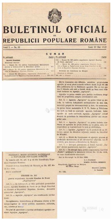 Decret de organizare a AGERPRES publicat în MO (Monitorul Oficial) nr. 32 din 23 mai 1949.