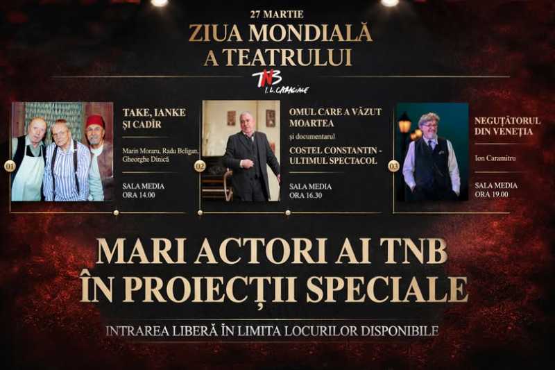*Teatrul Național 'I.L. Caragiale' din București organizează, pe 27 martie, evenimentul 'Mari actori ai TNB în proiecții speciale', la Sala Media, începând cu ora 14:00, cu acces gratuit în limita locurilor disponibile.