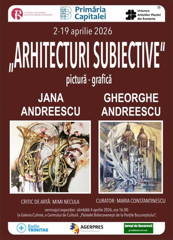 Sâmbătă, 4 aprilie 2026, de la ora 16:00, la Galeria Cuhnie, va avea loc vernisajul expoziției de pictură 'Arhitecturi subiective', semnată de artiștii Jana și Gheorghe Andreescu. Expoziția este curatoriată de Maria Constantinescu, artist vizual, și prezentată de Mimi Necula, critic de artă.