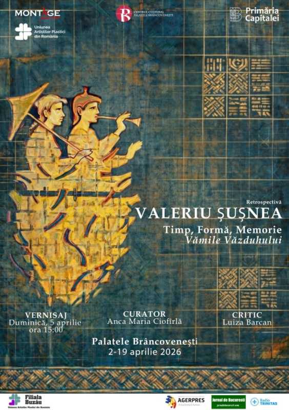 Duminică, 5 aprilie 2026, de la ora 15:00, la Galeria Parter Palat și Galeria Ghețărie, va fi vernisată expoziția de pictură și grafică 'Timp, Formă, Memorie - Vămile văzduhului', semnată de pictorul și profesorul Valeriu Șușnea, președintele Filialei Buzău a Uniunii Artiștilor Plastici din România. Expoziția este curatoriată de dr. Anca Maria Ciofîrlă și prezentată de Luiza Barcan, critic și istoric de artă.