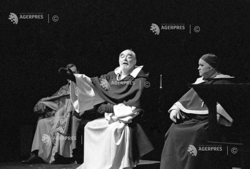 Actorul Mircea Albulescu (ctr.),în piesa de teatru 'Numele trandafirului' de Umberto Eco, 1994.