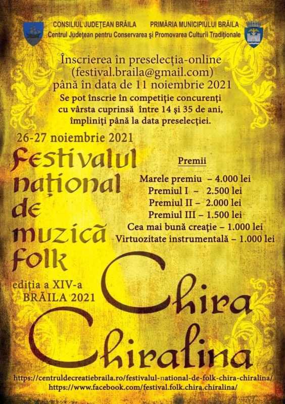 * Cea de-a XIX-a ediție a Festivalului Național de folk Chira Chiralina este organizată, în intervalul 24-26 aprilie, de Consiliul Județean Brăila, Centrul Județean pentru Conservarea și Promovarea Culturii Tradiționale Brăila, Primăria Municipiului Brăila. (sursa: https://centruldecreatiebraila.ro)